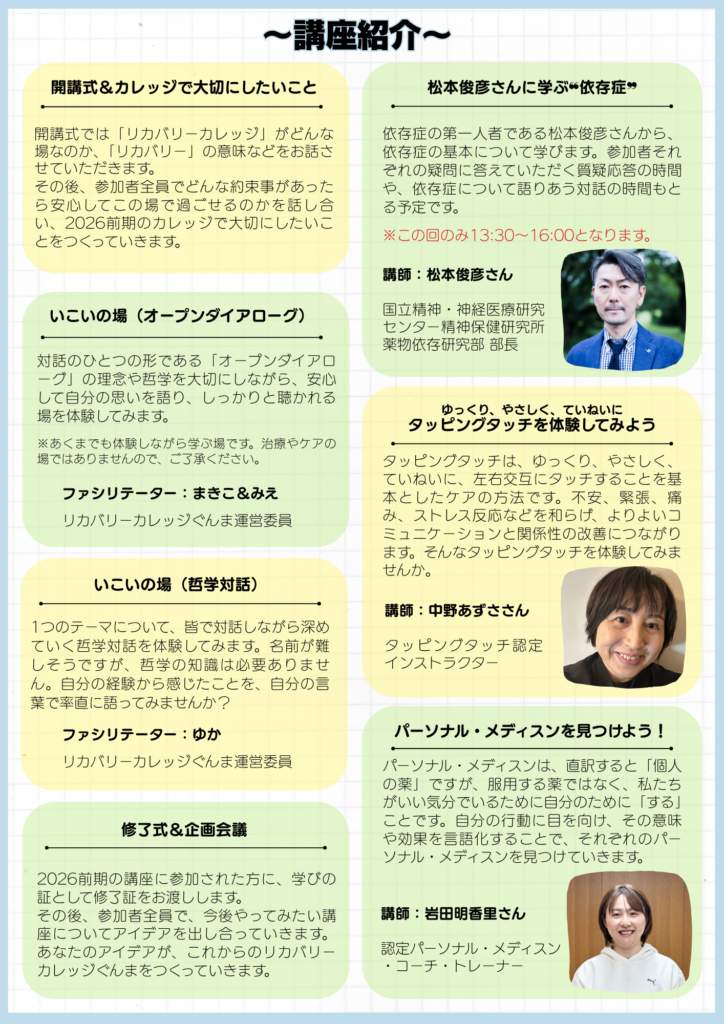 『リカバリーカレッジぐんま』は、メンタルヘルスの困難さを経験された方やそのご家族、医療や福祉の専門職、地域の方などが、互いに学び合い、それぞれに自分の思うリカバリーを目指す《対話》と《学び》の場です。